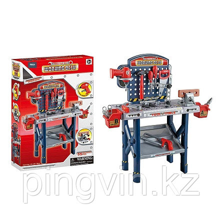 Рабочий стол с отверстиями для крепления винтов, дрель, пила, молоток, гаечный ключ, отвертка и другие аксессуары сделают игру юного мастера не забываемой;